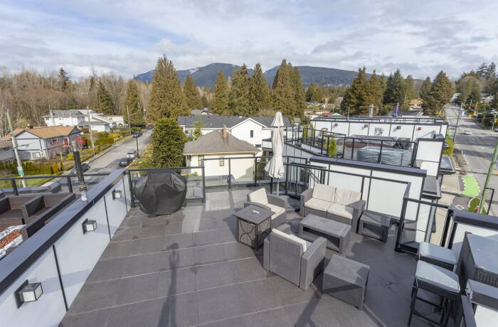 Beautiful, fully furnished 2-bedroom plus den townhouse with rooftop views in the heart of North Vancouver, offering a perfect blend of luxury and comfort.